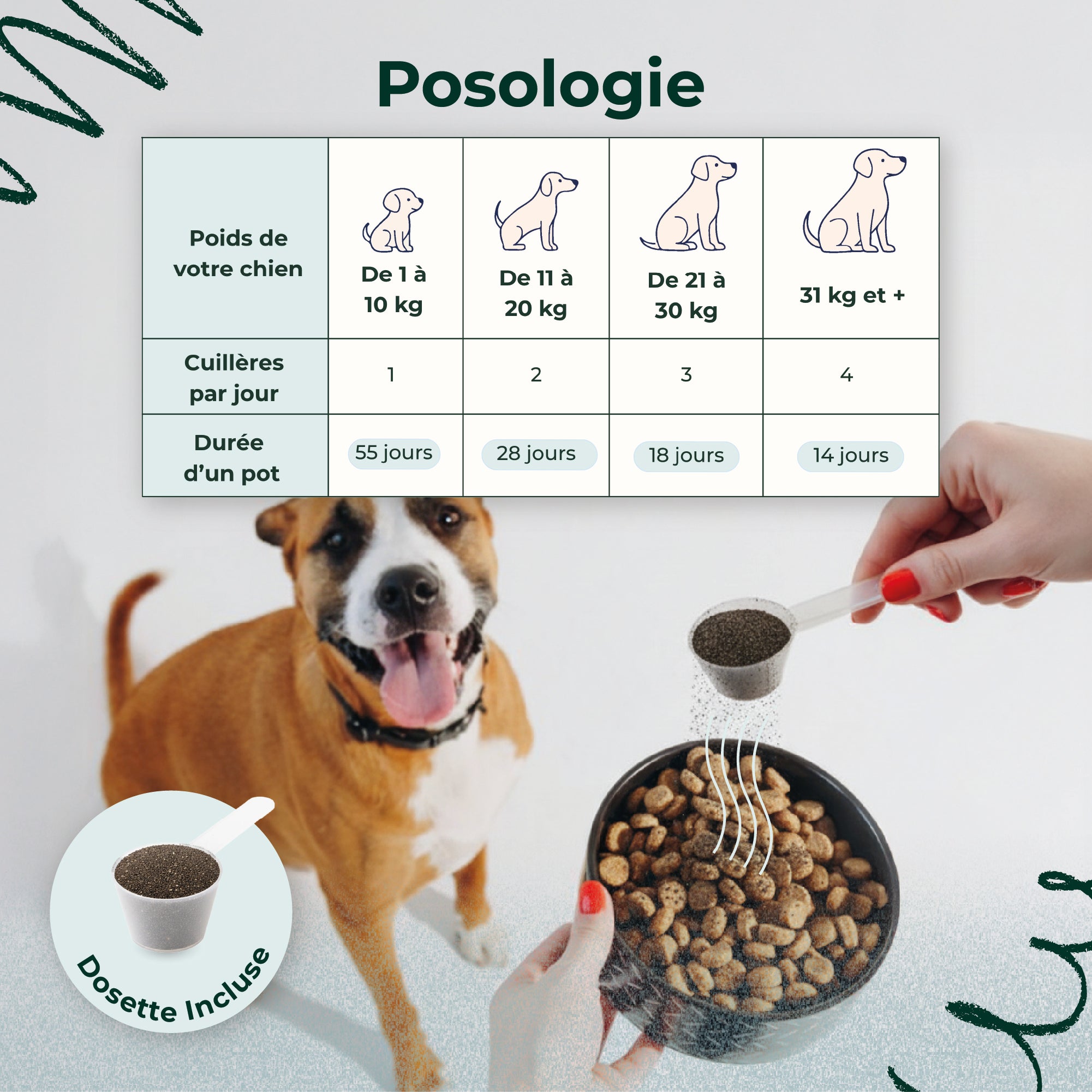 Sa texture fine se mélange facilement à la nourriture de votre chien, sans changer son goût. Pas besoin de brossage : votre compagnon profite des bienfaits de la formule naturellement, chaque jour.