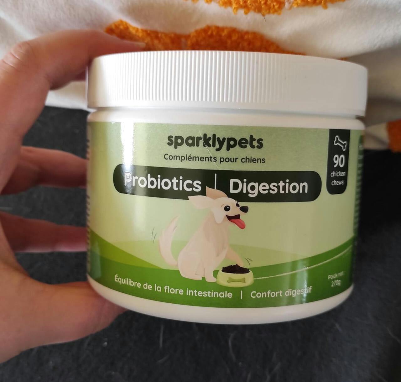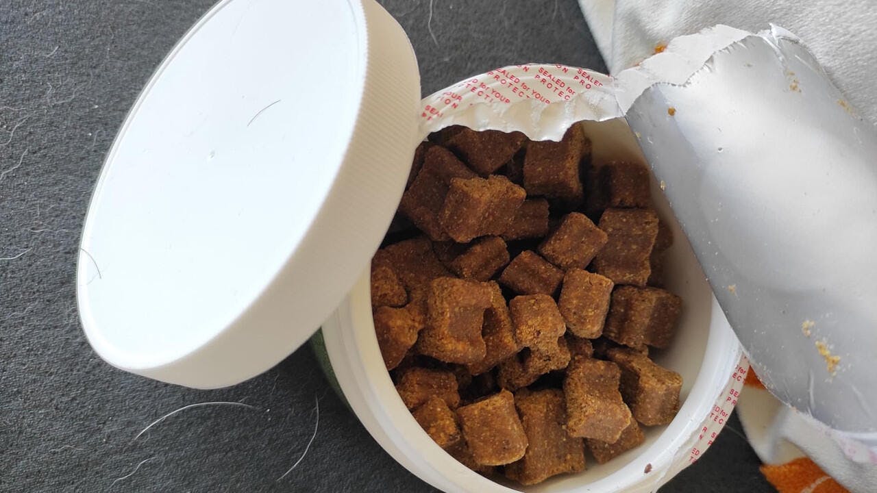 Composition : produit à base de pomme de terre, glycérine, levure inactivée (12.1.5), farine de pois, huile végétale, poudre de racines de chicorée, canneberge, carbonate de calcium, poudre de psyllium, pectine, maltodextrine, Lactobacillus Helveticus ha-122, Viandes et sous-produits animaux (volaille) 24,7%.